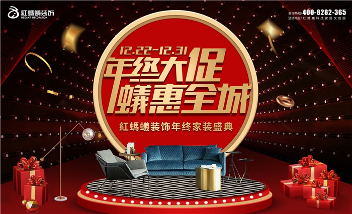 家装有态度、优惠有力度,红蚂蚁装饰为广大业主提供高品质家装服务的同时,为回馈广大客户的信任与支持,12月22日-31日,“年终大促、蟻惠全城”红蚂蚁装饰为客户带来年终家装盛典,火热进行中的家装盛典少不了超强力度的优惠与超值的奖品,1.设计定金50%可抵工程款;2.签约砸金蛋,100%中奖;3.签约就送装修基金;4.名品建材爆款特价2折起,例如:原价1075元/㎡的特地瓷砖,现价只需166元/㎡;原价378元/㎡的先锋地板,现价只需212元/㎡;原价635元/㎡的升华瓷砖,现价只需要113元/㎡等;5.主材贵1万赔5万。活动期间还有专业设计师为客户解答装修设计问题,想要了解更多活动详情,可以在活动期间前往红蚂蚁装饰科技家居文创园进行咨询,或直接拨打咨询热线:400-8282-365。