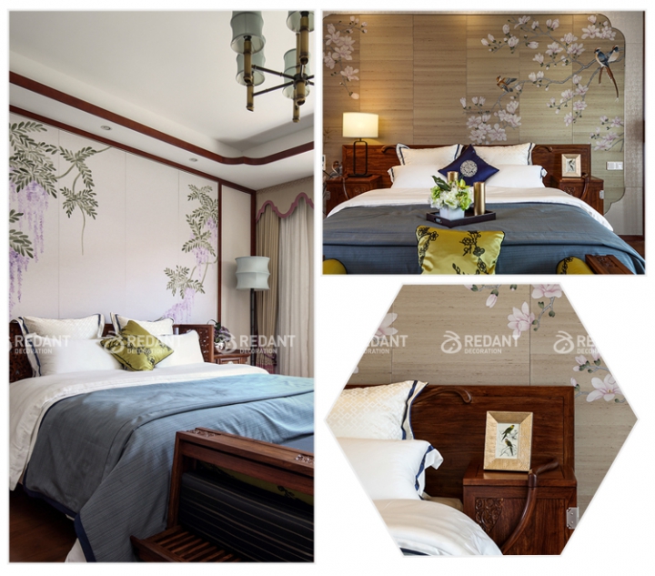 主卧室的设计采用对称式的手法来打造,大气而舒适、稳重、简洁却又不失尊贵,花鸟画的背景处理仿佛在讲述着一个古老的传说,床头的台灯营造温暖的格调。