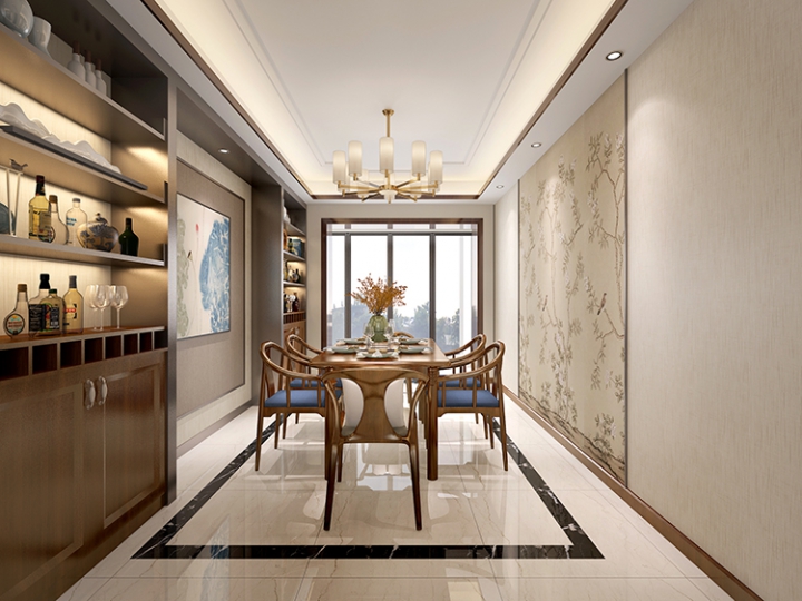 中国人在进餐方面十分的讲究,餐厅作为用餐的主要场所其装饰必不可马虎。餐厅墙壁有着国画般的水墨诗意。餐厅地板采用大理石设计,与餐桌椅色调一致,古朴、淡雅韵味十足。餐桌上的餐具优雅大方的盛放着,与餐桌上的淡黄色花朵进行巧妙的连接,生动充满生命力。