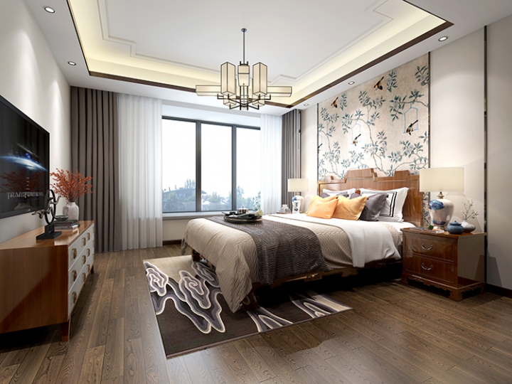 卧室的顶面用了中式元素的木线条,整体风格是十分淡雅的,木质地板和中式床头柜等家具都具有复古的特性,而床单确是清淡的米色,为了衬托床单的气质,背景墙以“一花一鸟”的图案作为装饰物,古韵添香、锦素流年!与整个房屋高雅的气质相照应。