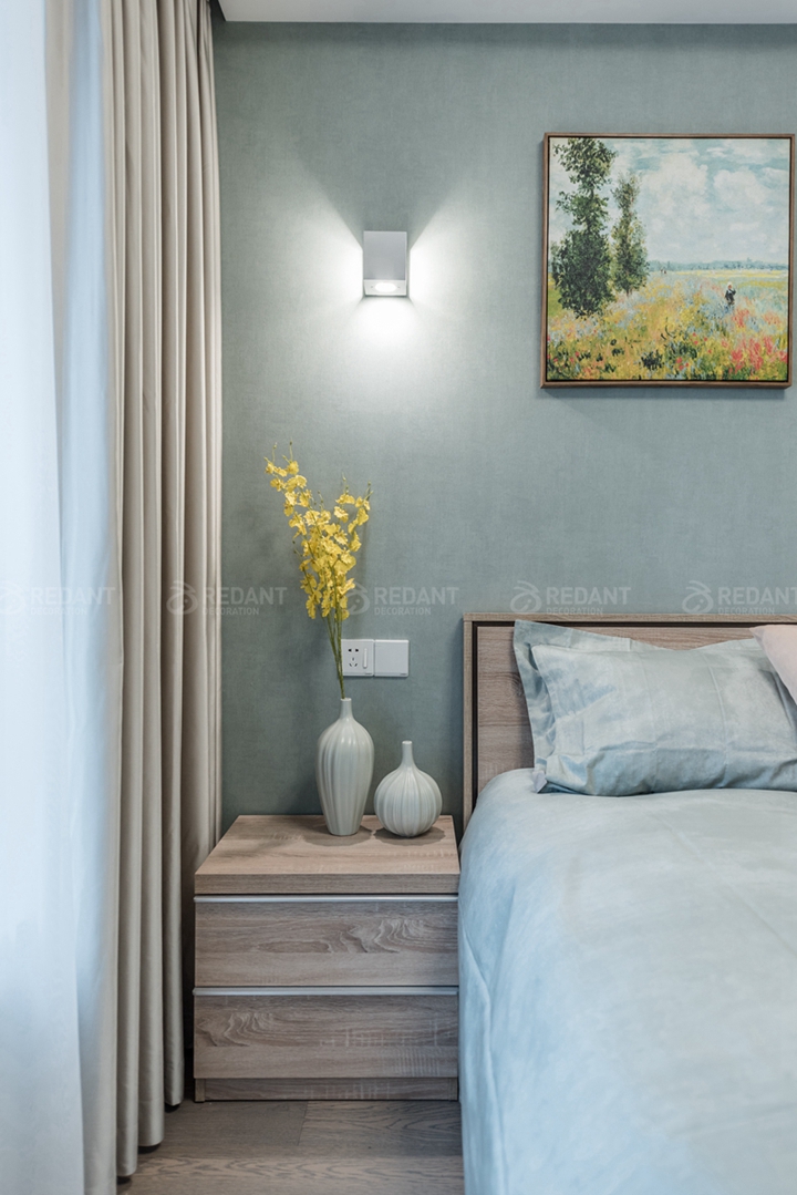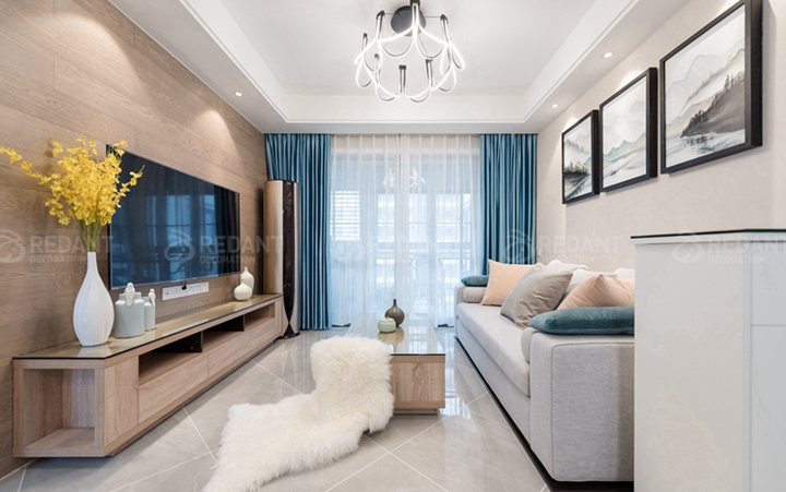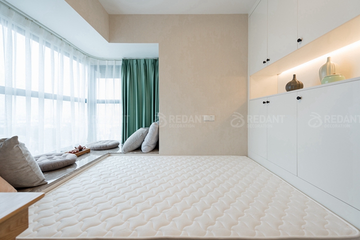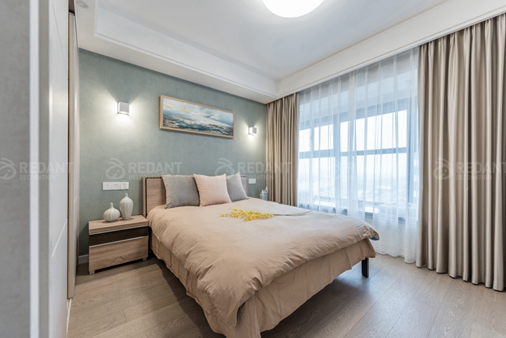本案业主经过沟通非常喜欢北欧风格,因为要和母亲一起住,母亲眼睛不好所以整体采用了浅色调,营造一种温馨舒服的感觉,客厅电视背景墙用木地板装饰,舒适又自然,布艺沙发配上偏中式的山水画,(业主喜欢古玩)轻微混搭,地面采用芒果的瓷砖进行斜贴,丰富不单调,卧室采用的米色窗帘与浅绿色背景搭配木色家具,给业主营造一个舒适的睡眠空间。榻榻米房间,不仅考虑收纳,同时又是客卧,局部考虑灯光细节,方便夜晚起来主灯刺眼的情况。当最终实景呈现在业主面前时,女主人和妈妈激动地握着设计师的手说着感谢的话,说没有选错红蚂蚁装饰,业主的满意是对我们最大的认可。