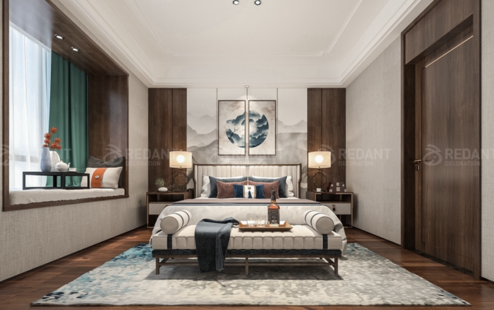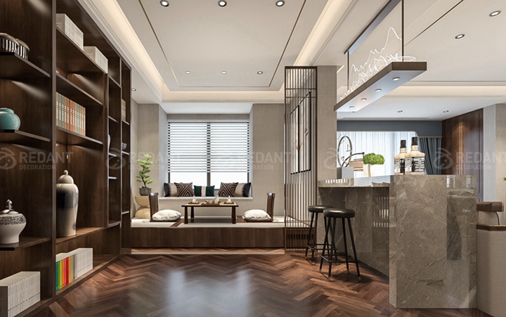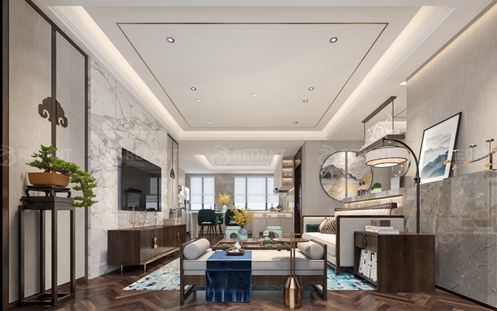 电视背景墙运用的栅格造型和电视柜上的鱼肚白石材同为中式元素相辅相成,清雅隽秀的山水纹理将空间的东方意境缓缓引出,时尚气息与人文底蕴融合得恰到好处。