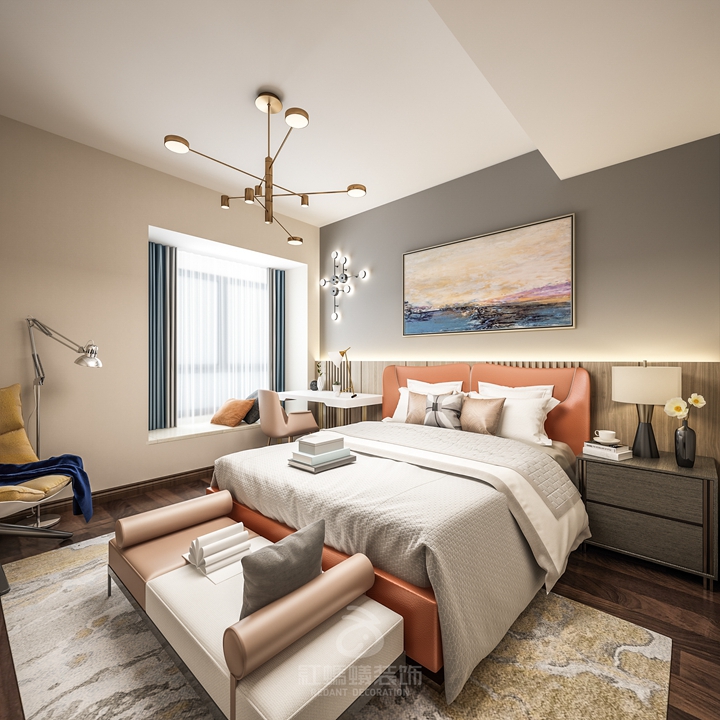 卧室部分沿用公共区域的配色,里外呼应,橙色调的床显得十分雅致,设计师应业主要求,使用了单个床头柜,另一边使用了书桌,将办公区域巧妙的融合到卧室里,一举两得。