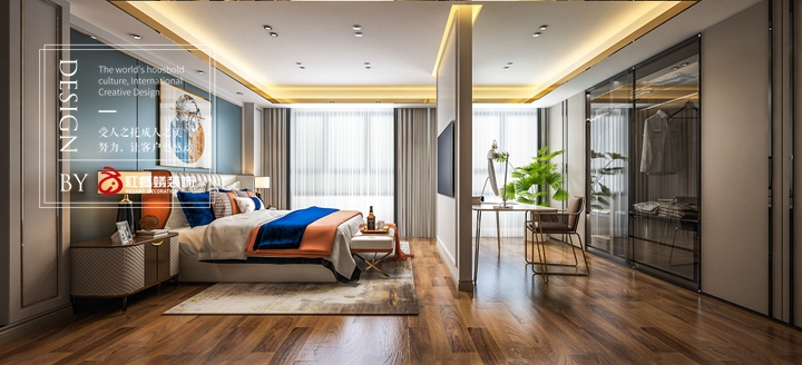 想要达到这样的目的,需要重点把握“轻”与“奢”的平衡。所谓“轻”,即为“简”,设计手法体现为去繁存简,以简单的立面利落的线条统一的配色,完成整体设计。而“奢”,以及软装上的“奢”。这里的“奢”,并非一味的贪图华贵之风,而是以品质及设计来体现其意义上的“奢”。就如客厅旁的金色金属隔断,吊顶里的金色线条,整体朴实,但就是有了这些点缀使得整体显得“简”而“奢”。大面积的颜色调配,以单色和相近色系为主,小面积加以亮色系点缀即可,如此一来,即可构成一副隽永之作,于细节之中泛着雅致与格调。