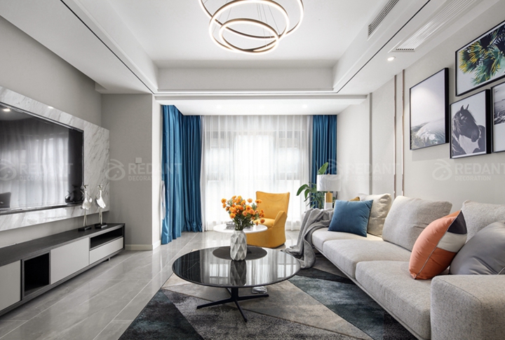 电视背景墙采用了爵士白大理石做饰面与湖蓝色高精密窗帘搭配,窗帘的丝滑加上大理石的干净的质感,更显时尚大气。