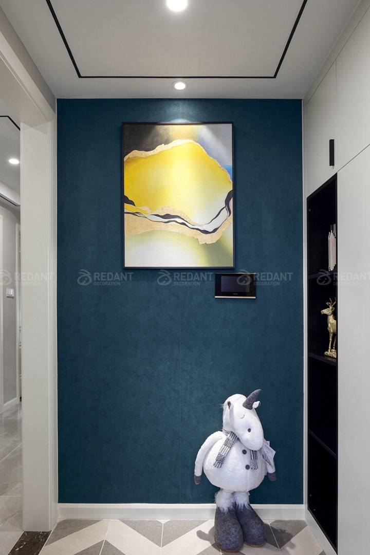 门厅地面用了米色与灰色的哑光瓷砖进行水刀切割进行鱼骨拼,看厌了清一色的方形走边,鱼骨拼更有颜色的跳跃和形状的变更而增加的视觉上的律动,墙面蓝色的墙纸与柠黄为主色调的挂画形成强烈对比视觉上更精神,右侧的鞋柜采用了封闭与半开放的设计,套色的黑色饰品格给业主喜欢的饰品安排了合理的位置。