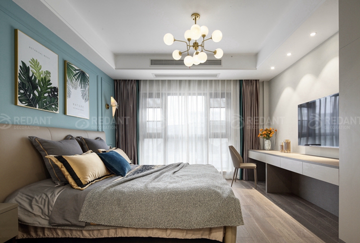 主卧室用几根简洁的线条加浅蓝的色彩便勾勒出卧室背景的造型,整个空间温柔又明亮,微风吹来薄纱微微飘起,风轻云淡的幸福生活便由此开始........更多苏州别墅装修实景案例请关注红蚂蚁装饰官网(www.hmyzs.com)