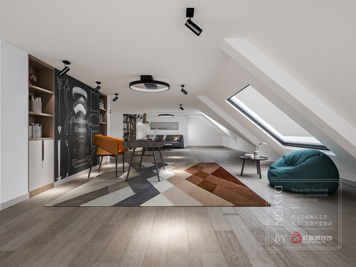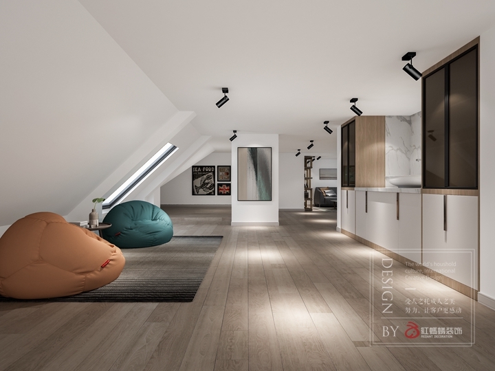 阁楼部分经过沟通,设计师做成有趣的休闲区域,在闲暇之余可以各自拥有自己的空间,阅读、打游戏、追剧、发呆……