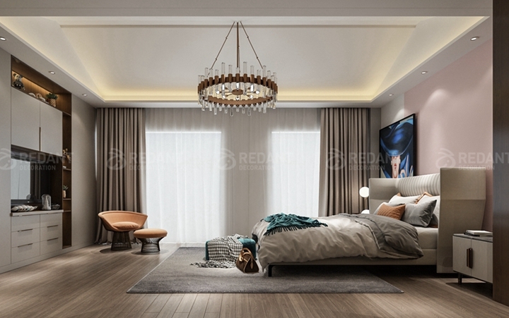 主卧的设计在延续客厅高级灰色调的基础上,穿插靓丽元素串联起空间的艺术想象,以此打造低调简净的休憩空间。