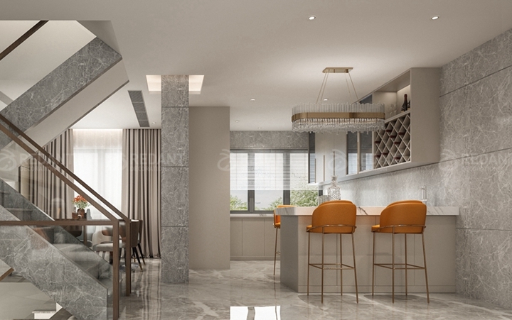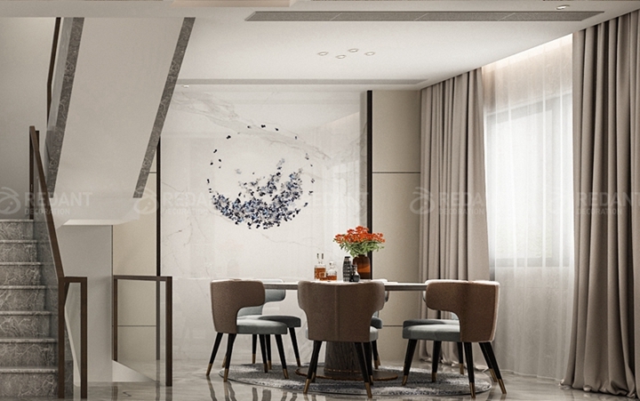 餐厅背景采用大理石装饰,视觉上给人很清爽的感觉。设计师根据客户的要求选择了圆形的餐桌,一家人有说有笑的围坐在圆形的餐桌边,边用餐边交谈,温馨祥和。