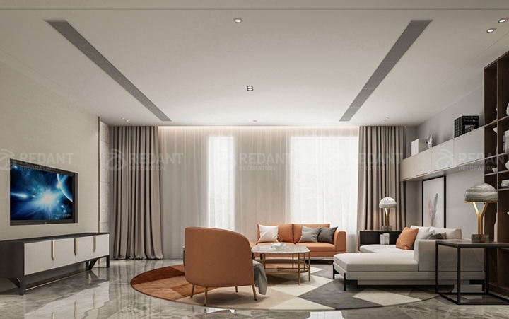 客厅,高级灰的底色中,一抹灵动的爱马仕橙作为点睛之笔,构建起冷暖平衡的空间韵律。电视背景墙上米色墙布与木材的朴质交互,搭配利落简练的现代家具及黄铜元素,让空间呈现出独特的艺术灵性。