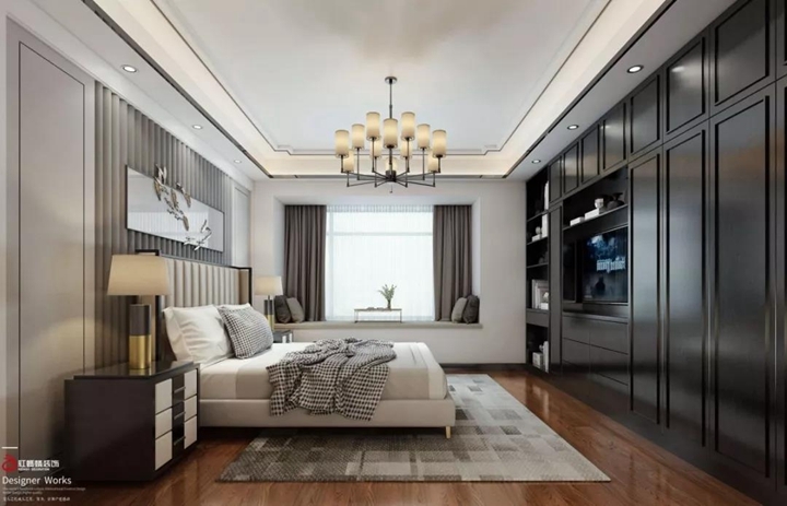 卧室是诗意氤氲的中式情调,素雅的暖色墙布和富有现代感的金属黑钛,通过背景装饰和床品的变换丰富着空间的气质。